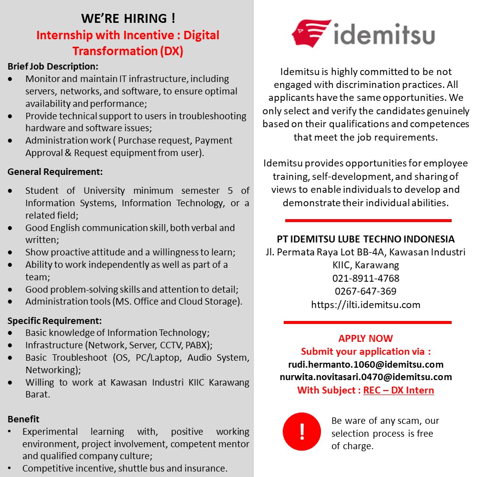 #InternshipVacancy PT Idemitsu Lube Techno Indonesia