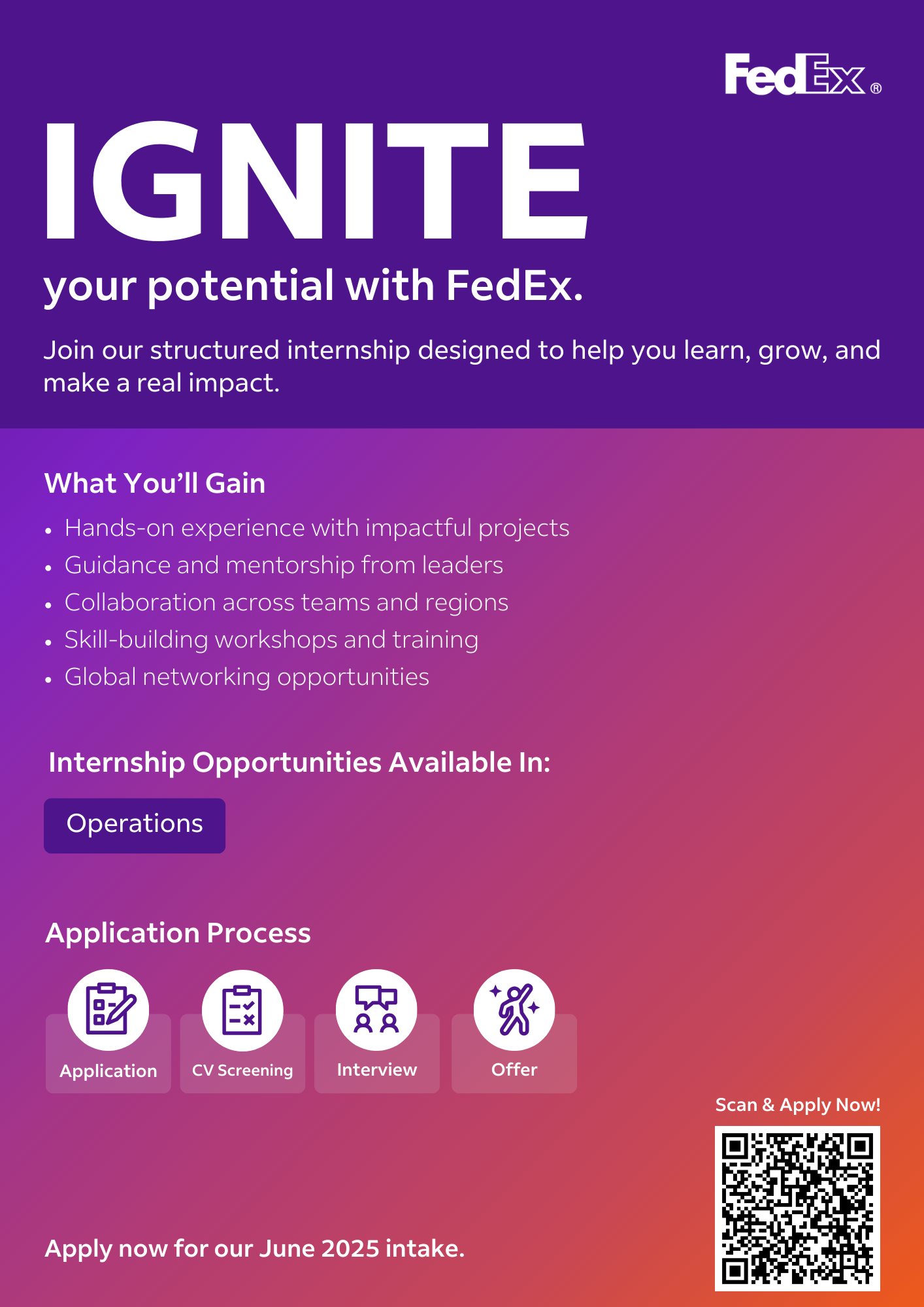 Hi Sobat CDC FEB UI FedEx Indonesia The IGNITE Internship Program is a 12-week internship at FedEx, offering high-potential youth the opportunity to gain hands-on experience, mentorship from industry experts, and practical skills to jumpstart their careers. Whether your interests lie in Operations, Global Services Provider, Operations Excellence Management, this structured program is designed to help you learn, grow, and make a real impact from day one. Internship Opportunities by Function Explore our available internship functions below. You may select your preferred internship function and indicate it in your application.