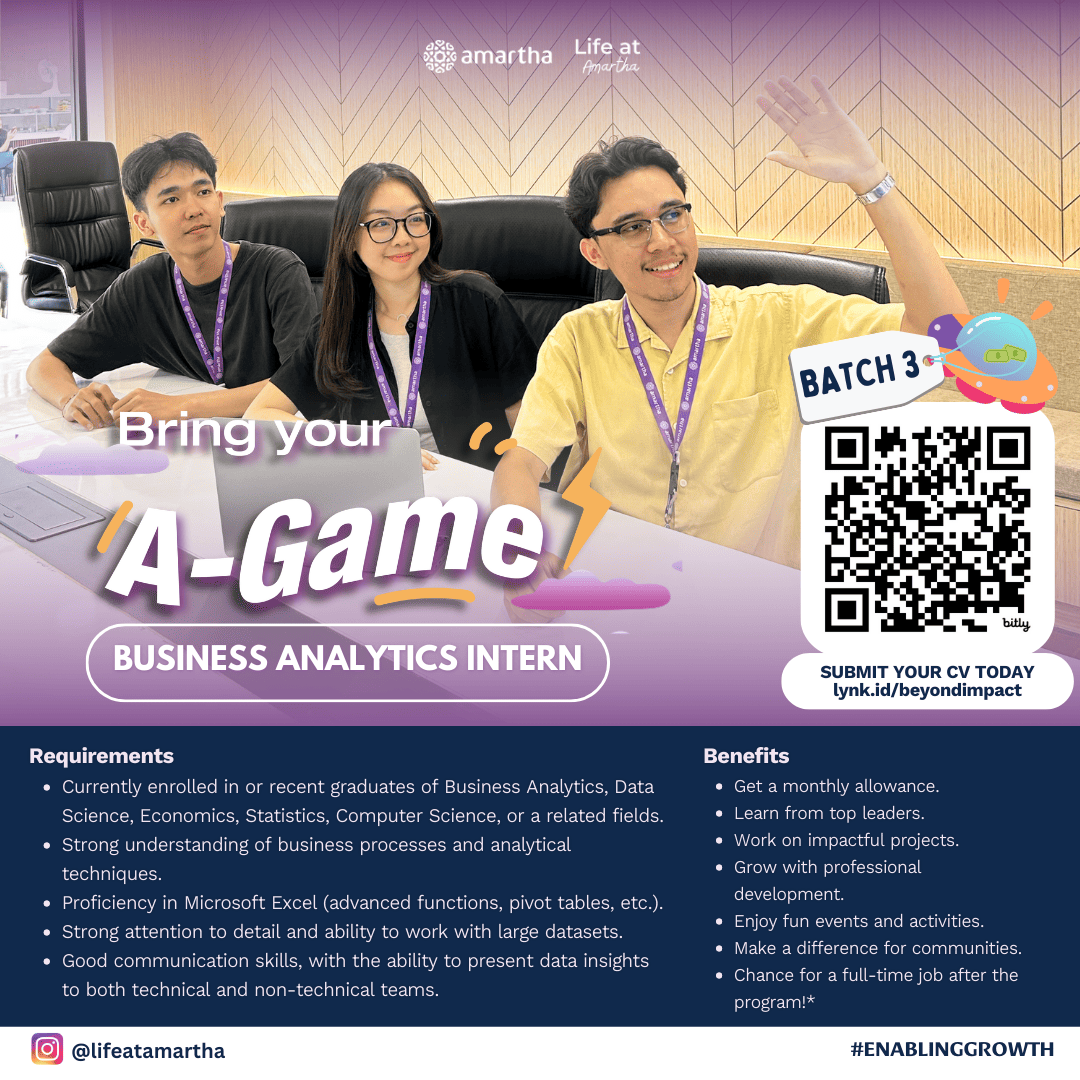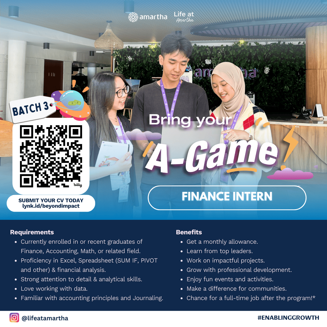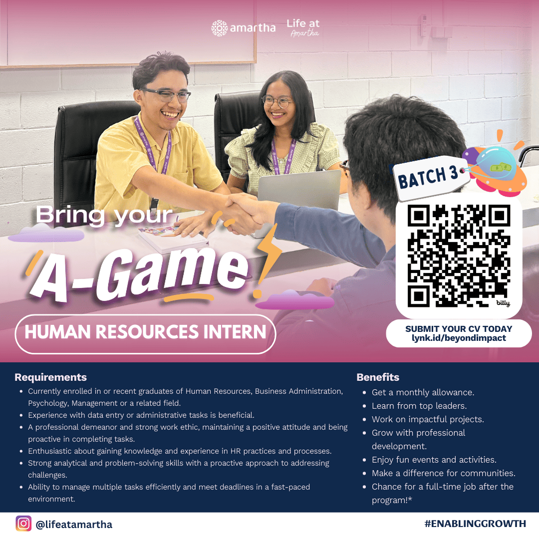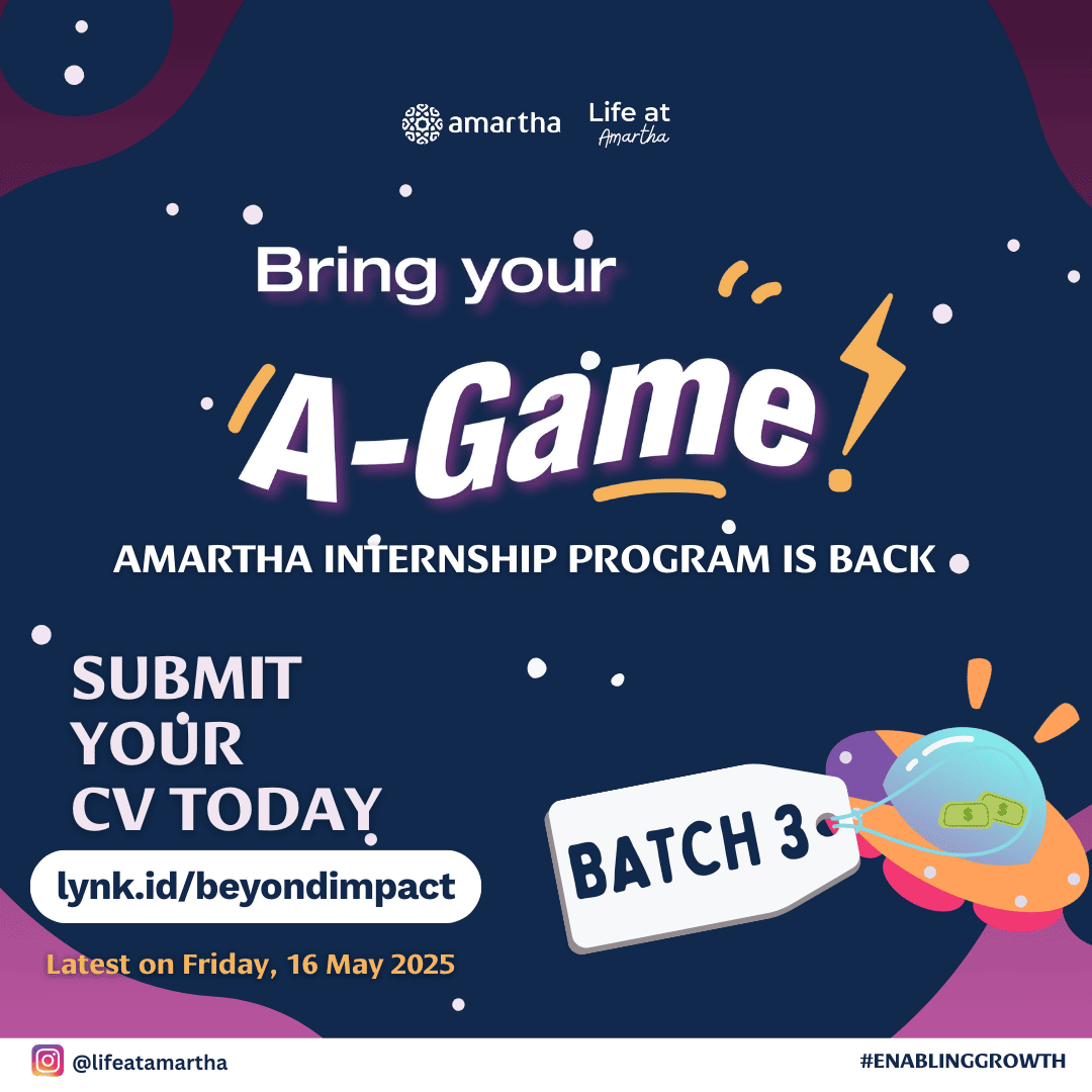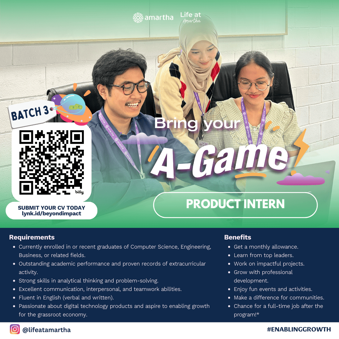Hi Sobat CDC FEB UI Come On Joint With Us Kick-start your growth with Amartha Internship Program: A-Game batch 3! 🚀 Starting your career in Business, Finance, Product or HR? Join A-Game Batch 3, Amartha's 6-month internship program (June-December), where you'll gain real-world experience. Mentorship, and hands-on projects that drive real impact. At Amartha, we believe in enabling growth for our people, our communities, and YOU! This is more than an internship; it's a chance to learn, lead, and thrive in a fast-growing tech company! 🙌 What's in it for you? 💸 Monthly allowance (yes, we got you!) 💻 Learn directly from top leaders. 🧑💻 Work on real, impactful projects. 📈 Build your skills and grow professionally. 🎉 Fun activities to keep things exciting! 🍃 Make a difference in communities. 🎓 And... a chance to land a full-time job after! Apply now at lynk.id/beyondimpact Don't miss out-this is your ticket to a brighter future. Let's grow together! 🚀 #Amartha #Internship #EnablingGrowth #EnablingLimitlessPotentials