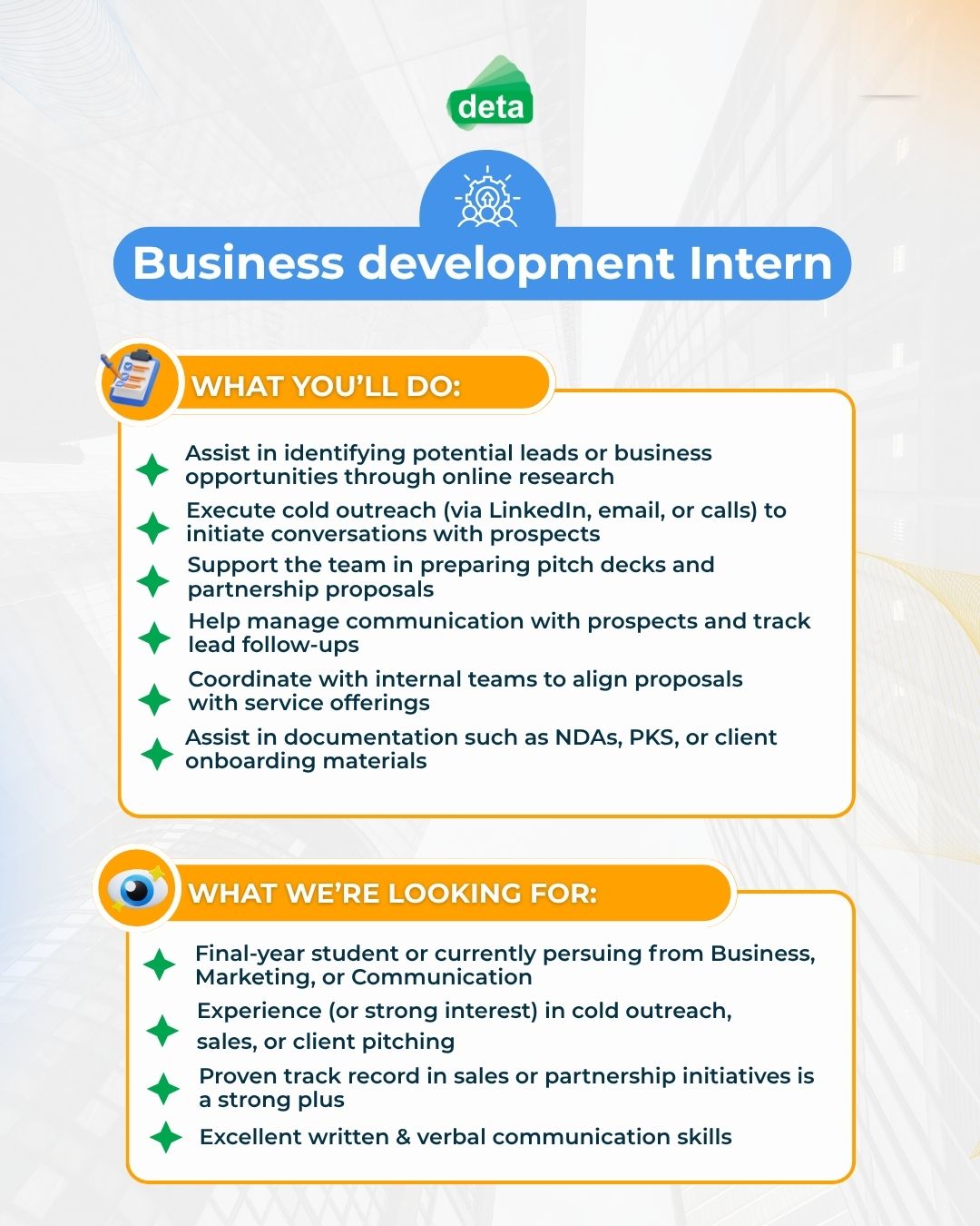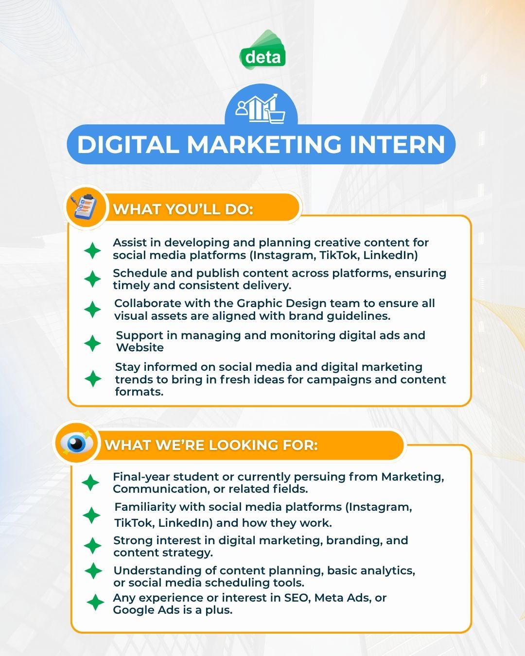 PT Deta Graha Mulya π Kickstart Your Career with a Paid Internship at DETA Agency! π Are you a Active university students or final-year students looking for a hands-on, real-world experience? We're looking for passionate, curious, and driven individuals to join our growing team at DETA! π― π Weβre Hiring: π― Business Development Intern Build connections, pitch ideas, and drive growth through proactive outreach and lead generation. π― Digital Marketing Intern Create engaging content, stay ahead of digital trends, and help manage our online presence across platforms. π― Marketing Research & Analyst Intern Dive into research, uncover insights, and support smarter strategy through data-driven decision-making. β¨ Why Join Us? β Real projects with real impact π Learn strategy, communication & digital execution π¬ Collaborate with a friendly, supportive team π Hybrid work setup β Cipinang, East Jakarta πΈ Monthly internship allowance πΏ Work-life balance that actually makes sense π Certificate of Completion + LinkedIn Recommendation π Who We're Looking For: - Active university students, final-year students, or fresh grads in Marketing, Business, Communication, Management, or related fields - Passionate about digital, branding, research, sales, or strategy - Strong in communication, organization, and curiosity to grow - Eager to contribute and learn in a fast-paced creative environment π Apply now via linktr.ee/DETA.AGENCY π¬ Know someone perfect for this? Tag them below! π More about us: deta.co.id #InternshipVacancy PT Deta Graha Mulya PT Deta Graha Mulya is open for Internship. For more information go to this link: https://cdc.ui.ac.id/pt-deta-graha-mulya-7/ #infomagang #lowonganmagang