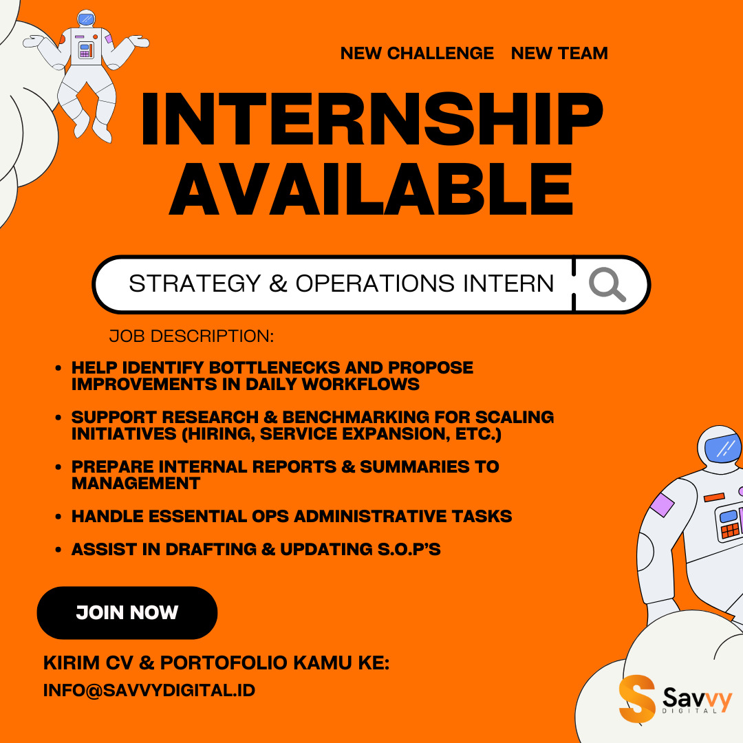 Savvy Digital membuka kesempatan magang untuk posisi Strategy & Operations Intern. 📌 Cocok untuk kamu yang tertarik di bidang manajemen, strategi bisnis, dan operasional. Job Description: ✅ Mengidentifikasi hambatan & memberi solusi perbaikan workflow harian ✅ Mendukung riset & benchmarking untuk inisiatif scaling (hiring, ekspansi layanan, dll) ✅ Menyusun laporan & ringkasan untuk manajemen ✅...Read More