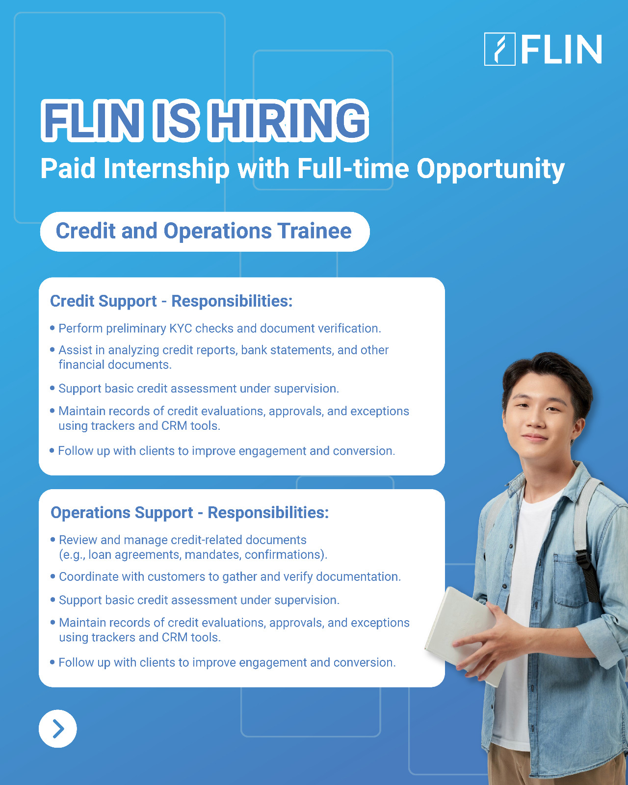 FLIN is Hiring – Paid Internship 💼 Posisi: Credit and Operations Trainee Kesempatan magang berbayar dengan peluang full-time! 📍 Lokasi: Onsite, Jakarta Selatan 🗓 Durasi: 3–6 bulan Kualifikasi: • Mahasiswa tingkat akhir atau lulusan (Finance, Commerce, Business Administration, atau bidang terkait) • Mahir MS Excel (formulas, filters, pivots) • Komunikasi lisan & tulisan yang baik...Read More