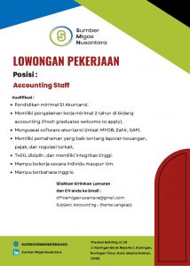 PT Sumber Migas Nusantara membuka kesempatan bagi lulusan S1 Akuntansi yang berkompeten dan berdedikasi untuk bergabung sebagai Accounting Staff!