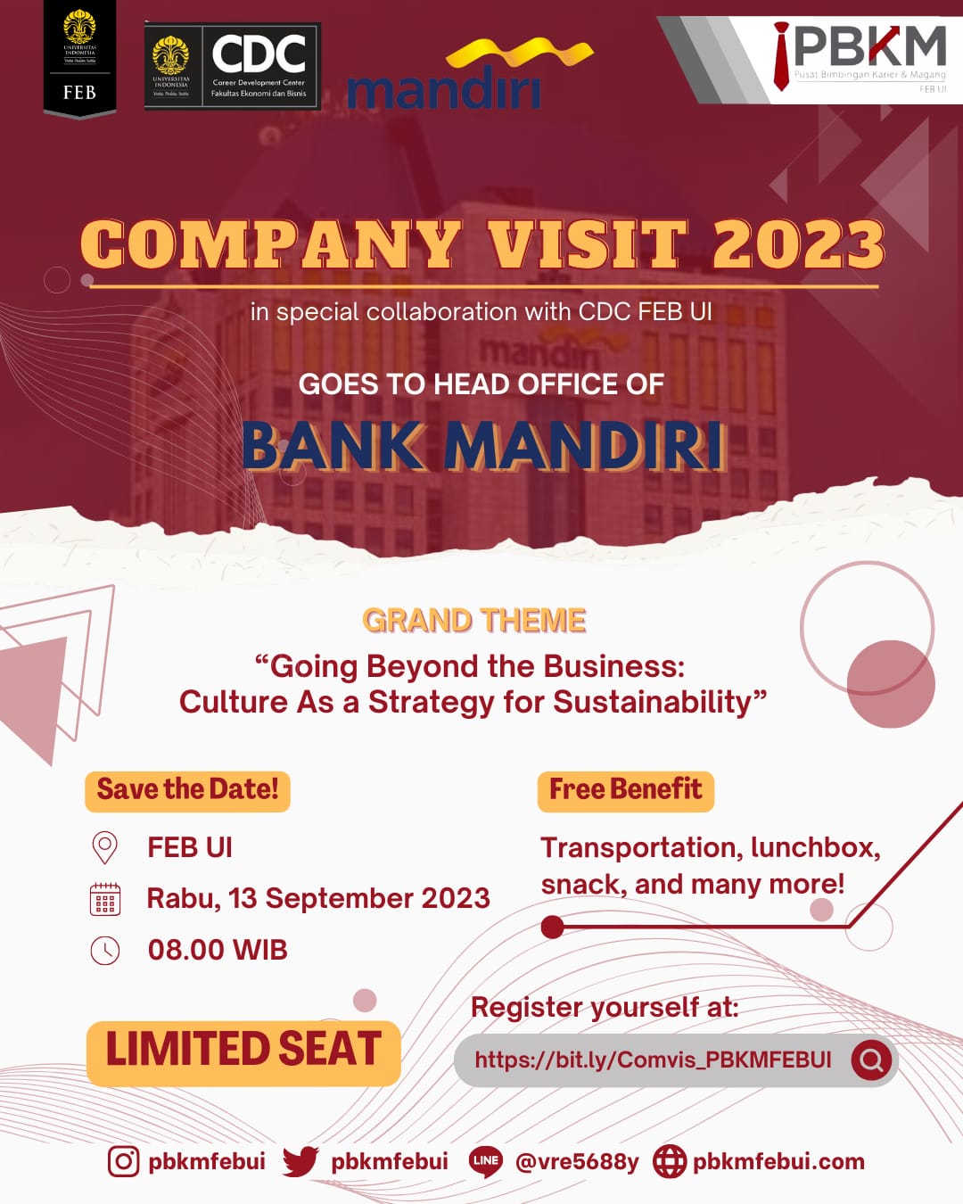 [PBKM FEB UI Goes to Bank Mandiri] Ever wonder why a business can survive for such a long term period? Does a good working environment really mean something for the business? Pusat Bimbingan Karir dan Magang (PBKM) in collaboration with Career Development Center (CDC) FEB UI proudly presents COMPANY VISIT 2023 x BANK MANDIRI âGoing...Read More