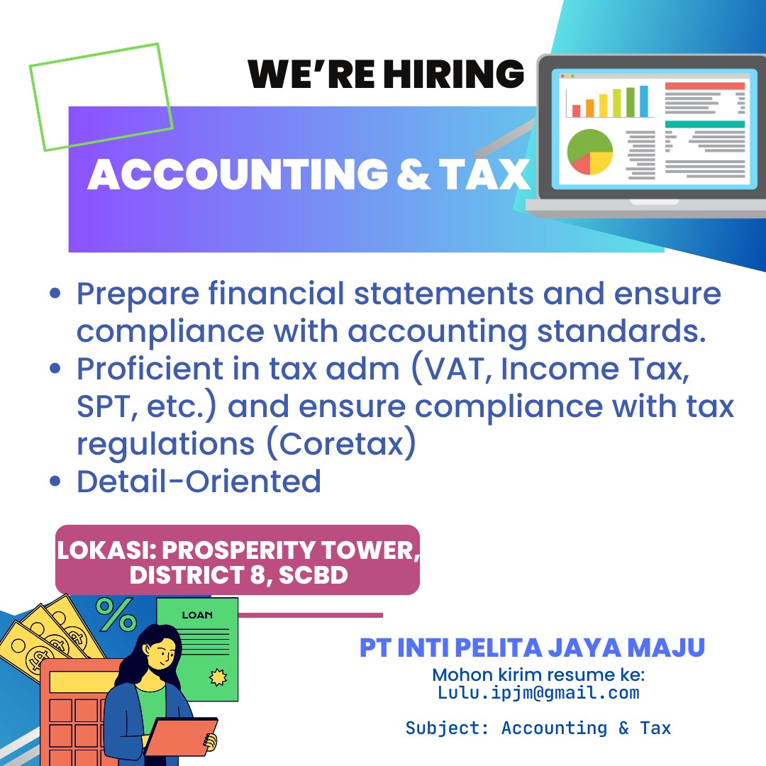 PT Inti Pelita Jaya Maju sedang membuka kesempatan bergabung untuk Anda yang berkompeten dan bersemangat! Kami mencari kandidat terbaik untuk mengisi posisi berikut: 1. Accounting & Tax Tugas utama meliputi penyusunan laporan keuangan serta memastikan kepatuhan terhadap standar akuntansi. Kandidat diharapkan menguasai administrasi perpajakan (VAT, PPh, SPT, dll.), memahami regulasi perpajakan (Coretax), serta memiliki...Read More