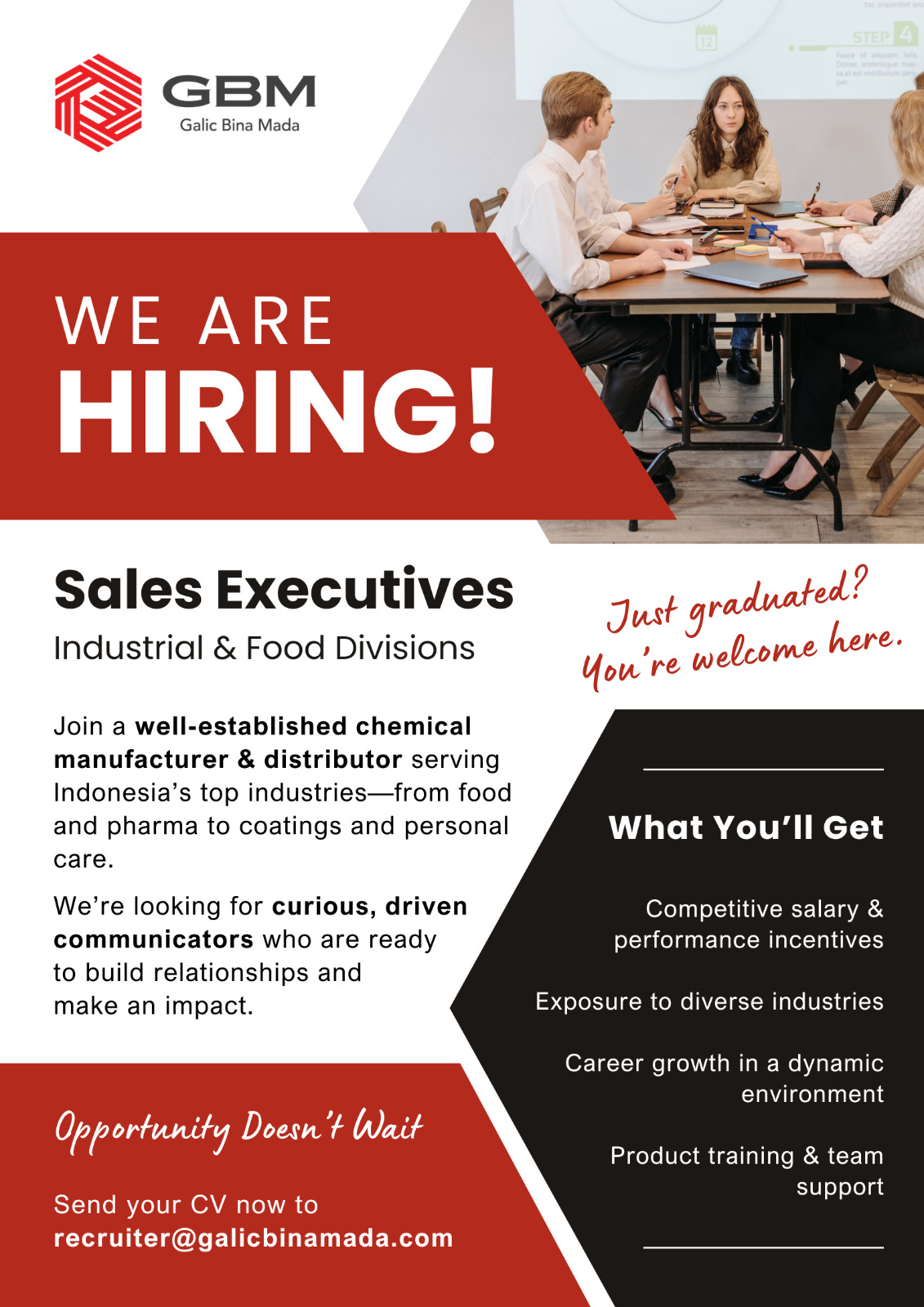 PT Galic Bina Mada membuka kesempatan bagi para talenta muda terbaik untuk meniti karir sebagai Sales Executive. Kami membuka ruang bagi lulusan Teknik Kimia, Teknik Industri, Teknologi Pangan, Bioteknologi, atau lainnya yang relevan, ikut berkontribusi membentuk masa depan industri pangan, tekstil, cat, dan berbagai industri manufaktur lainnya. Teman-teman yang baru lulus, atau sudah punya pengalaman...Read More