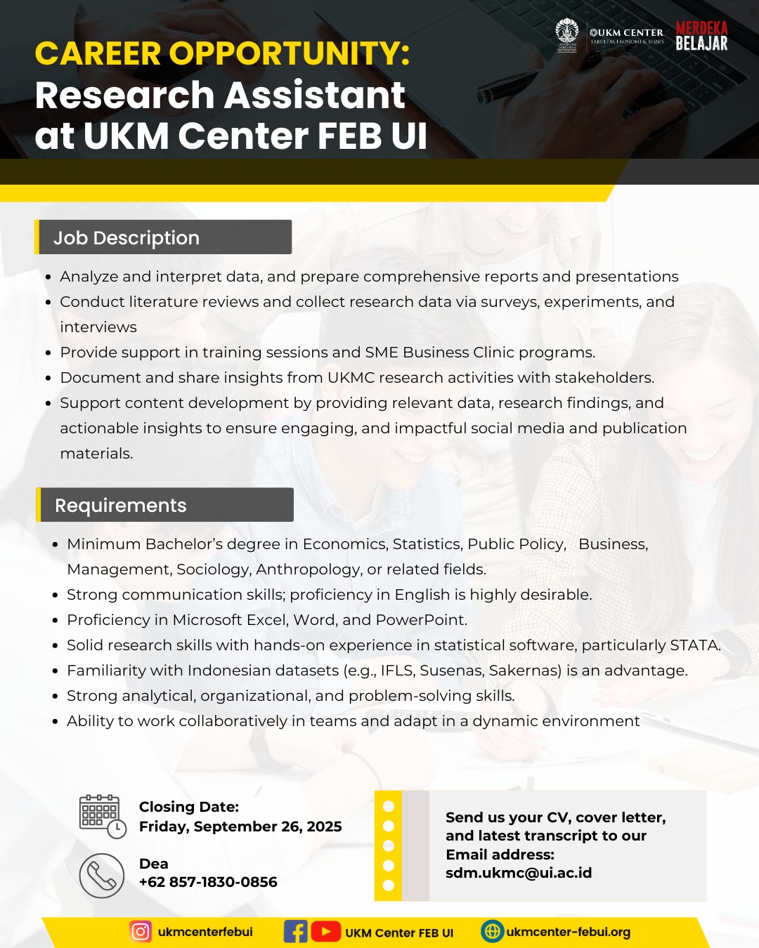 โจ Career Opportunity: Research Assistant at UKM Center FEB UI โจ UKM Center FEB UI membuka kesempatan bagi kamu yang passionate di bidang riset, data, dan UMKM untuk bergabung sebagai Research Assistant! ๐ ๐ Job Description: โข Analisis & interpretasi data, serta penyusunan laporan riset โข Literature review & pengumpulan data riset (survei, eksperimen, wawancara)...Read More