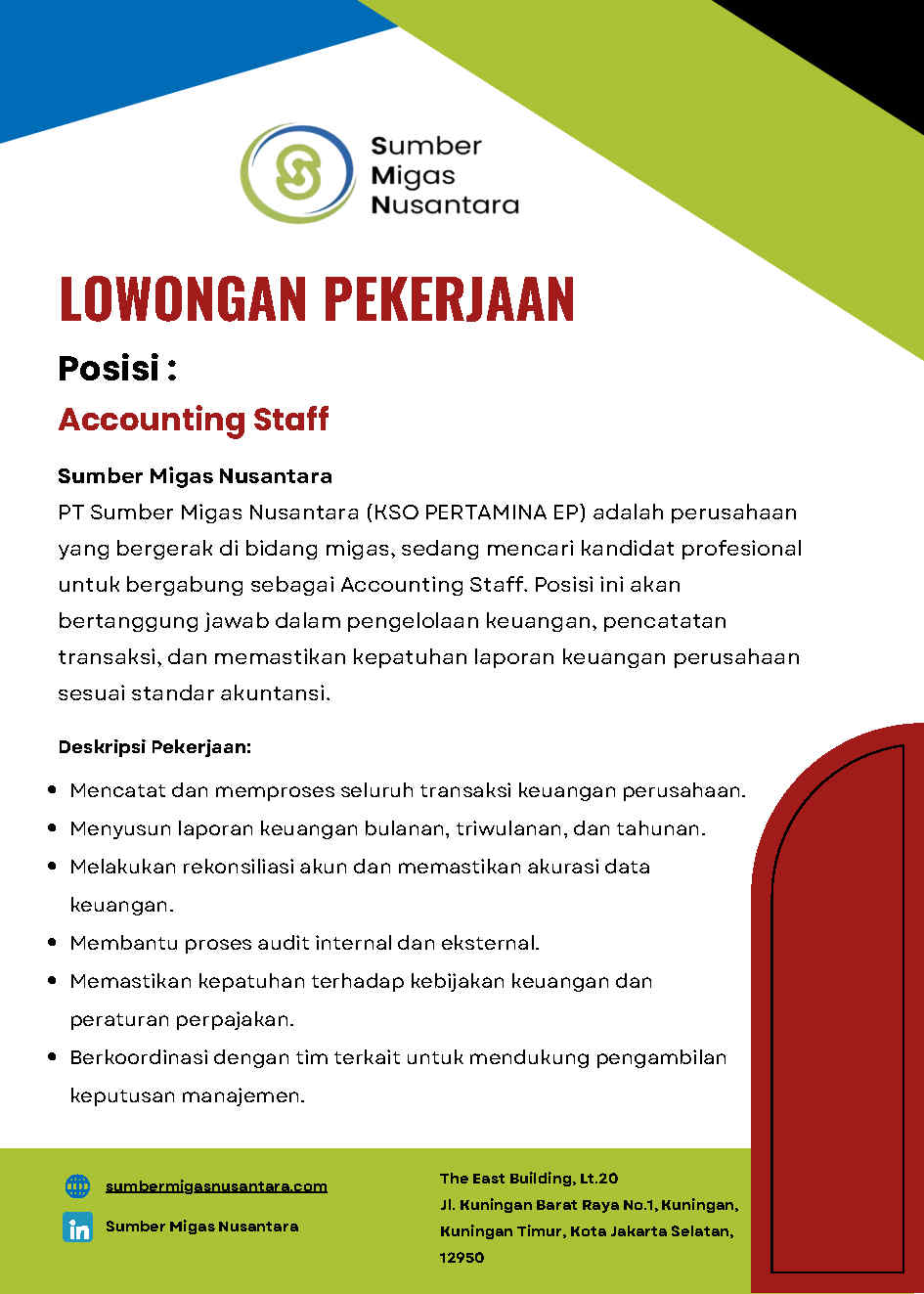 We’re Hiring! PT Sumber Migas Nusantara membuka kesempatan bagi lulusan S1 Akuntansi yang berkompeten dan berdedikasi untuk bergabung sebagai Accounting Staff! Kualifikasi – Lulusan S1 Akuntansi – Pengalaman minimal 2 tahun di bidang accounting (fresh graduates welcome to apply!) – Menguasai software akuntansi – Teliti, disiplin, dan memiliki integritas tinggi – Mampu kerjasama dalam tim...Read More