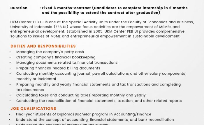 Career Development Center Fakultas Ekonomi dan Bisnis Universitas Indonesia (CDC FEB UI) menyediakan layanan informasi program internship atau magang bagi mahasiswa tingkat akhir yang berencana memperoleh pengalaman kerja profesional. Melalui kerja sama yang telah terjalin dengan berbagai perusahaan berskala nasional, multinasional, serta Badan Usaha Milik Negara (BUMN), CDC FEB UI membuka akses terhadap berbagai peluang magang strategis. Inisiatif ini ditujukan untuk mendukung peningkatan kompetensi mahasiswa, baik dalam aspek soft skills maupun hard skills, guna mempersiapkan mereka secara optimal dalam memasuki dunia kerja yang dinamis dan kompetitif.